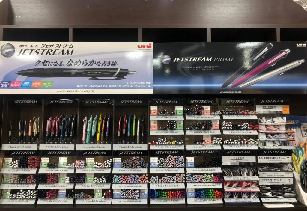 【文苑堂野村店様】にてあのなめらかな書き味で知られるジェットストリームがたくさんの種類を揃えて展開されております。一言にジェットストリームといっても多機能ペンや単色ペン、替え芯等多数取り揃えております。お近くにお越しの際はぜひお立ち寄りください。