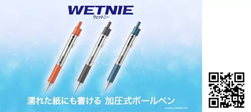 従来のボールペンでは書きにくかった水に濡れた紙への筆記や、壁に設置したボードの紙面にそのまま上向き筆記ができるボールペンです。
