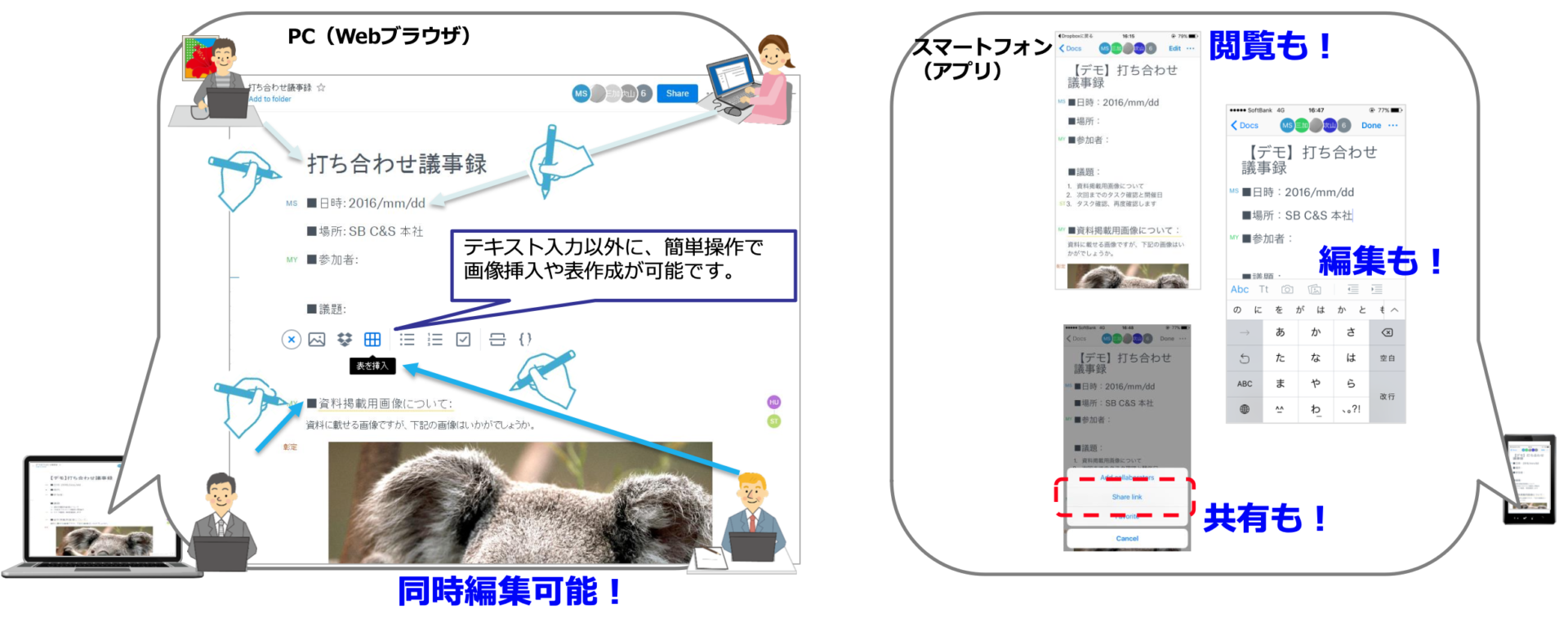 表や画像ファイルの挿入が簡単にでき、複数人で同時編集も可能です。